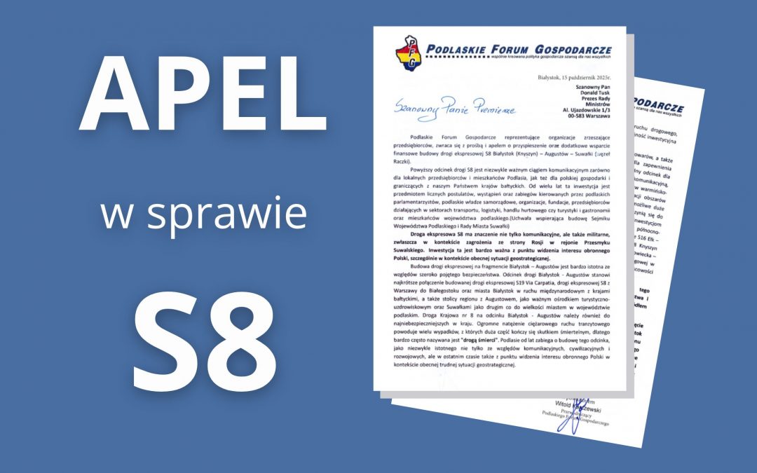Jak piszą autorzy apelu, „nową okolicznością, która daje szansę na przyspieszenie budowy tego strategicznego ciągu komunikacyjnego jest uruchomienie Funduszu Bezpieczeństwa i Obronności w ramach Krajowego Planu Odbudowy, co będzie dodatkowym źródłem finansowania tejże ważnej inwestycji. Mając powyższe na uwadze apelujemy do Pana Premiera i rządu RP o podjęciu działań w wyżej wymienionej sprawie oraz przyspieszenie i dofinansowanie budowy drogi S8 Białystok (Knyszyn) – Augustów – Suwałki (węzeł Raczki), która jest strategiczna dla naszego regionu i całej Polski północno-wschodniej. Brak tej drogi powoduje negatywne skutki dla całego regionu, pozbawia województwo podlaskie szans na rozwój gospodarczy, nowoczesne połączenia i poprawę bezpieczeństwa” – czytamy w piśmie.