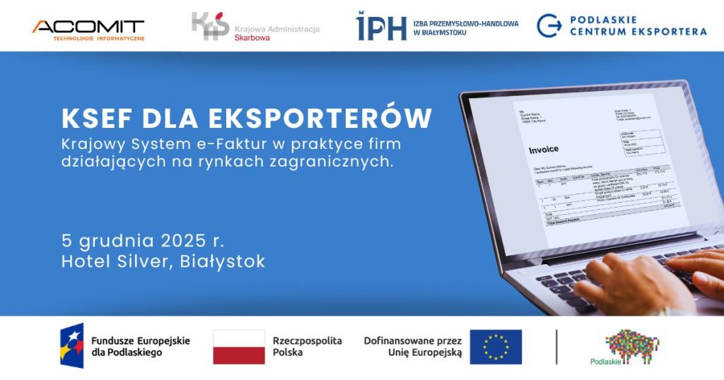 „Krajowy System e-Faktur (KSeF) w praktyce firm działających i rozwijających się na rynkach zagranicznych” – to temat specjalistycznego seminarium zorganizowanego przez IPH w ramach projektu Podlaskie Centrum Eksportera. Spotkanie odbyło się 5 grudnia, a frekwencja dopisała. Partnerami wydarzenia były Krajowa Administracja Skarbowa oraz ACOMIT.